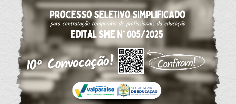 A Secretaria Municipal de Educação de Valparaíso de Goiás publicou a Convocação nº 10/2026, referente ao Processo Seletivo Simplificado nº 005/2025, convocando candidatos aprovados e classificados para envio da documentação necessária à contratação temporária.