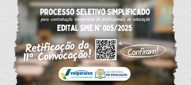 A Secretaria Municipal de Educação de Valparaíso de Goiás publicou a retificação da 11ª convocação do Processo Seletivo Simplificado nº 005/2025, destinada à contratação temporária de profissionais da educação.