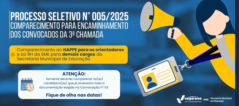 A Secretaria Municipal de Educação de Valparaíso de Goiás (SME), por meio do Departamento de Gestão de Recursos Humanos (DGRH), informa aos candidatos classificados e convocados na 3ª chamada do Processo Seletivo Simplificado nº 005/2025 que o comparecimento para emissão do encaminhamento de lotação ocorrerá conforme cronograma abaixo.