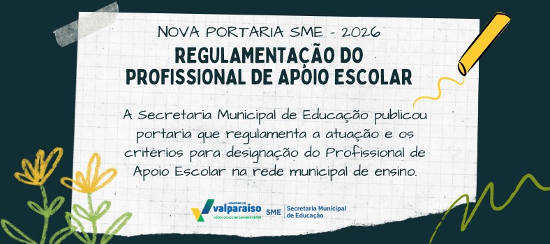 A Secretaria Municipal de Educação de Valparaíso de Goiás publicou a Portaria nº 019, de 30 de janeiro de 2026, que regulamenta a atuação, as modalidades, o quantitativo, os critérios de solicitação, concessão e designação, a organização funcional, o Estudo de Caso específico e a avaliação do Profissional de Apoio Escolar, exercido pelo cargo de Assistente de Gestão Educacional, no âmbito da Rede Municipal de Educação.