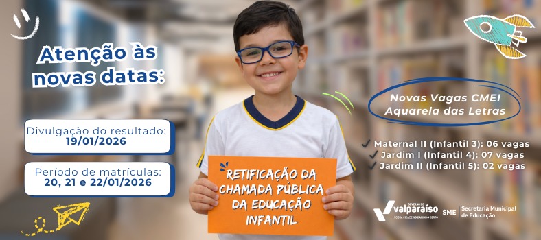 O Município de Valparaíso de Goiás, por meio da Secretaria Municipal de Educação, no uso de suas atribuições legais, torna pública a RETIFICAÇÃO o Edital de Chamada Pública nº 007/2025, publicado em 02 de dezembro de 2025, nos seguintes termos: