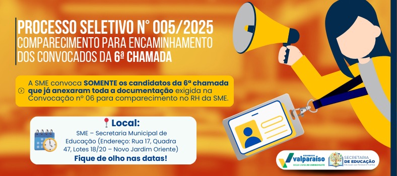 A Secretaria Municipal de Educação de Valparaíso de Goiás, por meio do Departamento de Gestão de Recursos Humanos (DGRH), convoca os candidatos classificados e convocados na 6ª Chamada do Processo Seletivo Simplificado nº 005/2025, que já anexaram toda a documentação exigida na Convocação nº 06, para comparecimento presencial com a finalidade de emissão do encaminhamento de lotação.