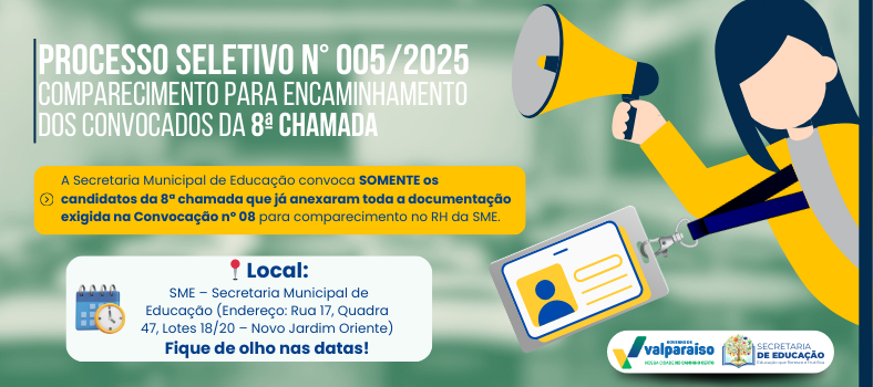 A Secretaria Municipal de Educação de Valparaíso de Goiás, por meio do Departamento de Gestão de Recursos Humanos (DGRH), convoca os candidatos classificados e convocados na 8ª Chamada do Processo Seletivo Simplificado nº 005/2025, que já anexaram toda a documentação exigida na Convocação nº 08, para comparecimento presencial com a finalidade de emissão do encaminhamento de lotação.