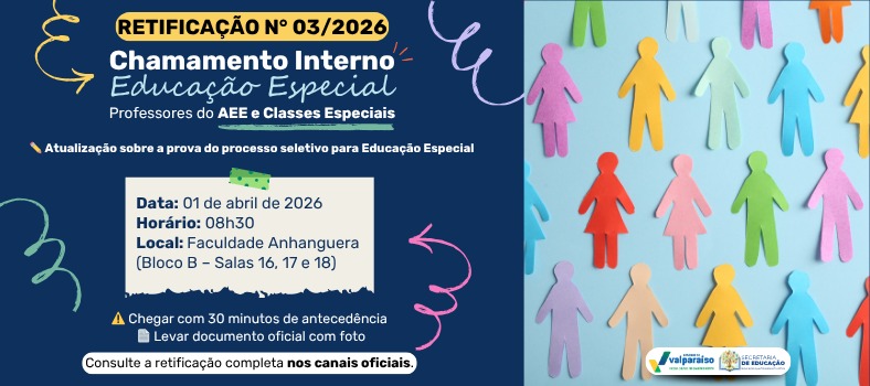 A Secretaria Municipal de Educação de Valparaíso de Goiás publicou a retificação do Chamamento Interno nº 001/2026, que trata da seleção de professores efetivos da rede municipal para atuação na Educação Especial, nas funções de Atendimento Educacional Especializado (AEE) e Professor de Classe Especial.