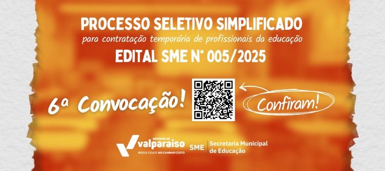 A Secretaria Municipal de Educação de Valparaíso de Goiás publicou a Convocação nº 06/2026, referente ao Processo Seletivo Simplificado nº 005/2025, destinada aos(as) candidatos(as) aprovados(as) e classificados(as) para contratação temporária.